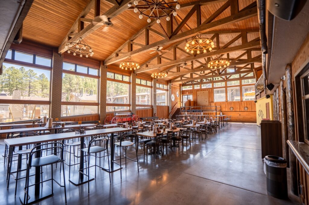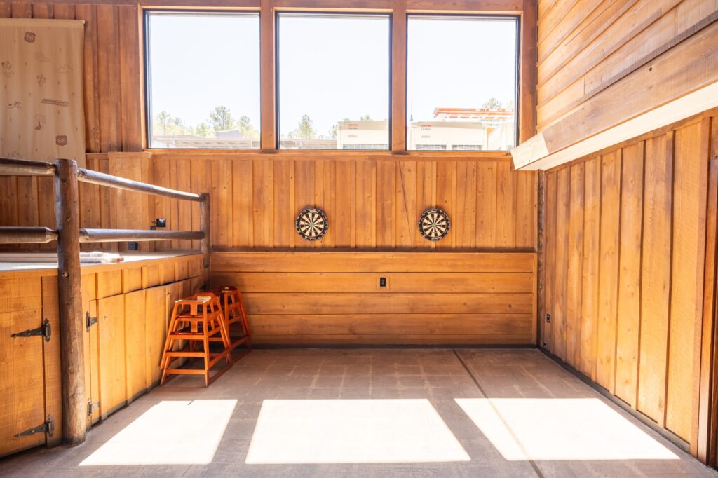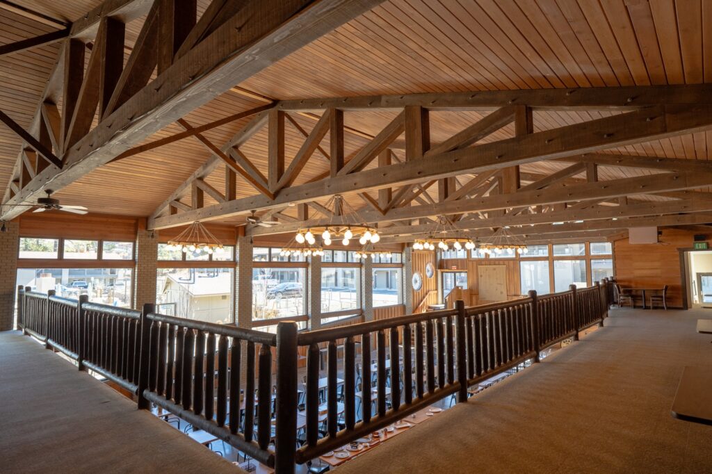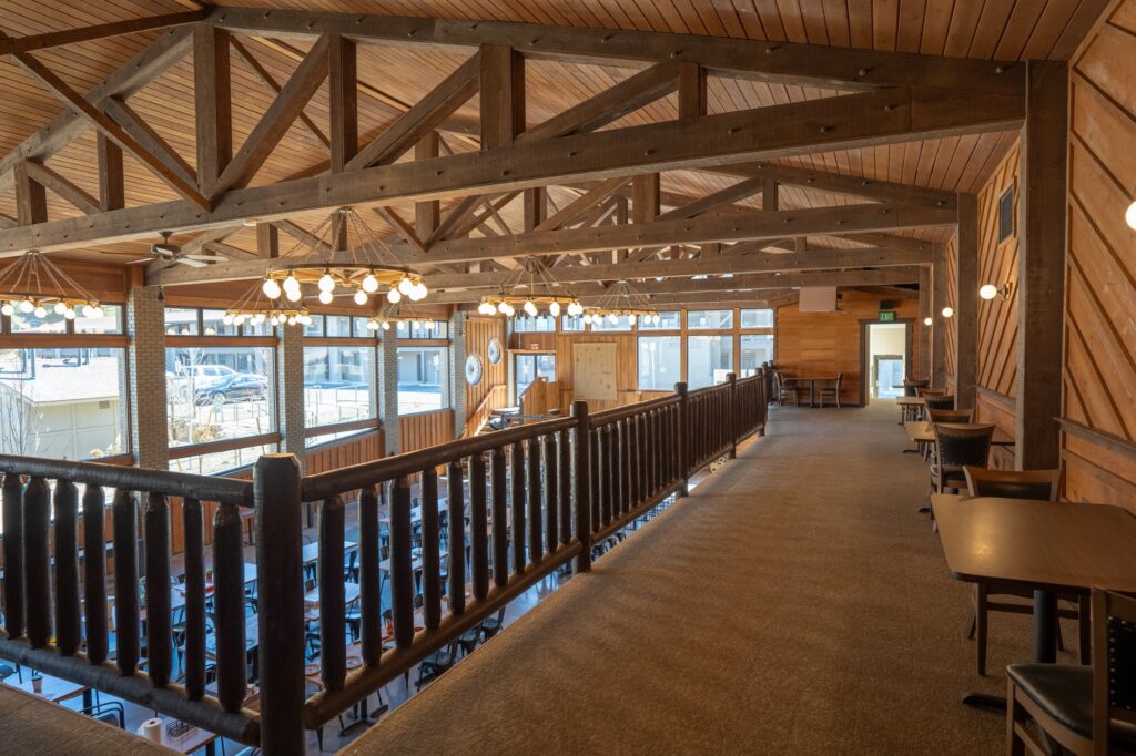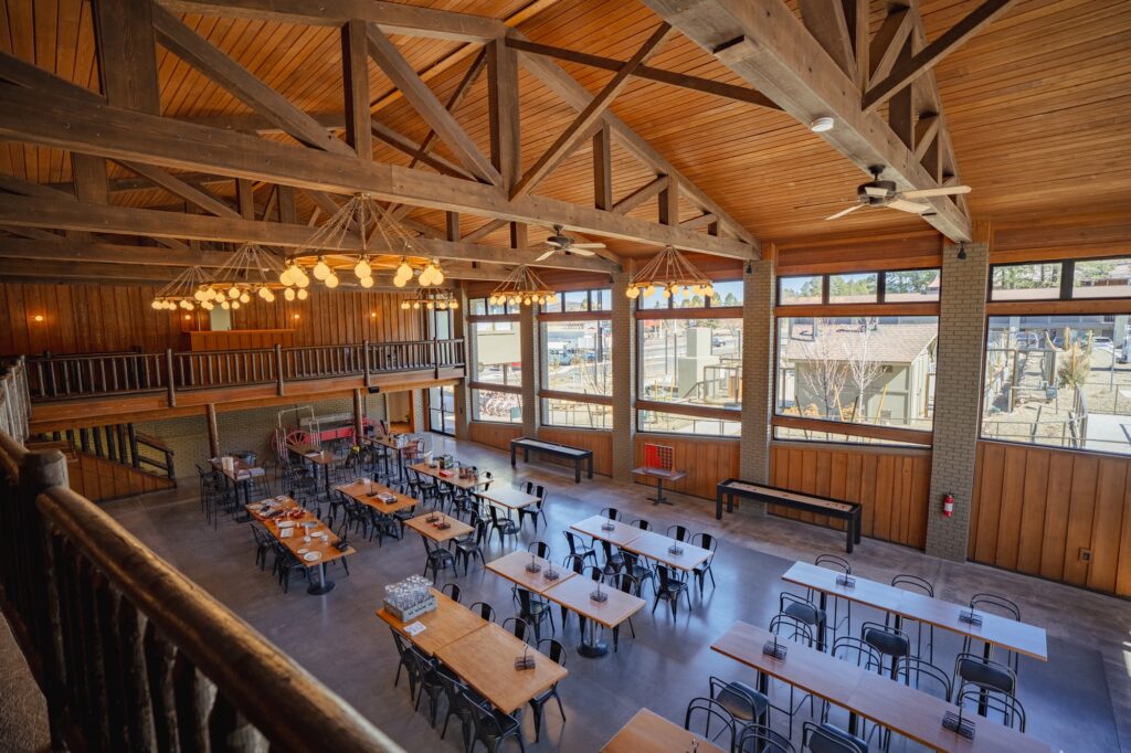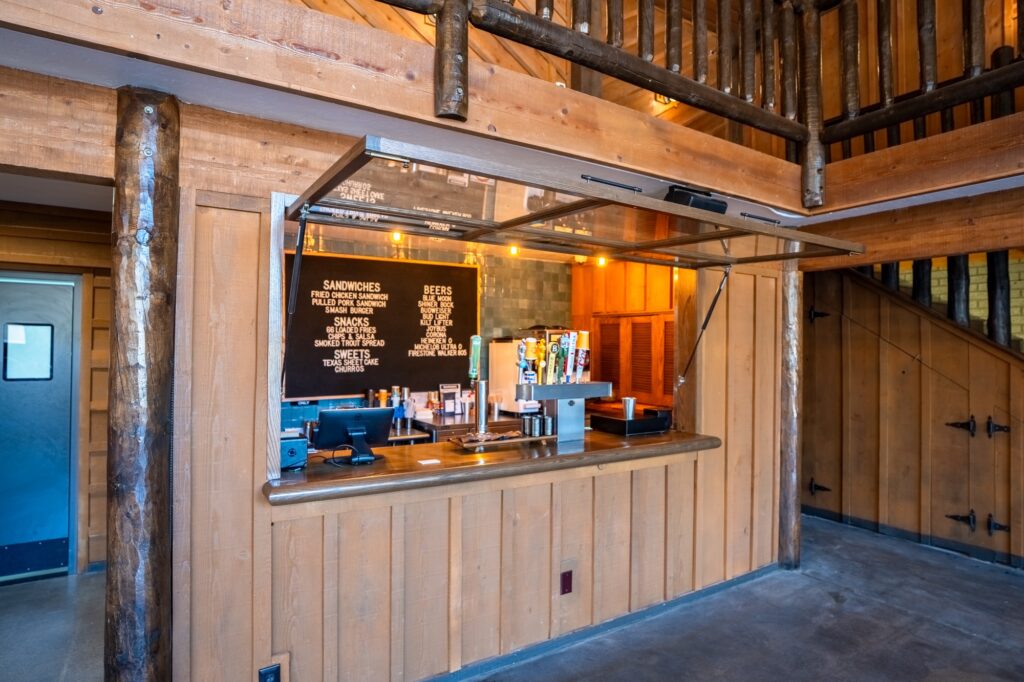The main gathering space, known as “Camp Hall,” is a two-story building that underwent a full interior and exterior transformation. The renovated space now includes a large gathering hall, service bar with concession counter, and a welcoming lobby featuring a custom two-sided fireplace. Additional highlights include custom oak millwork cabinetry and display shelving, as well as a custom check-in counter with a leather-wrapped front and brass countertops.