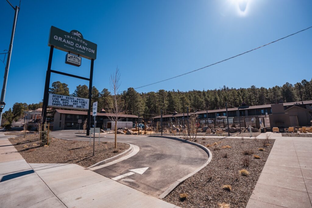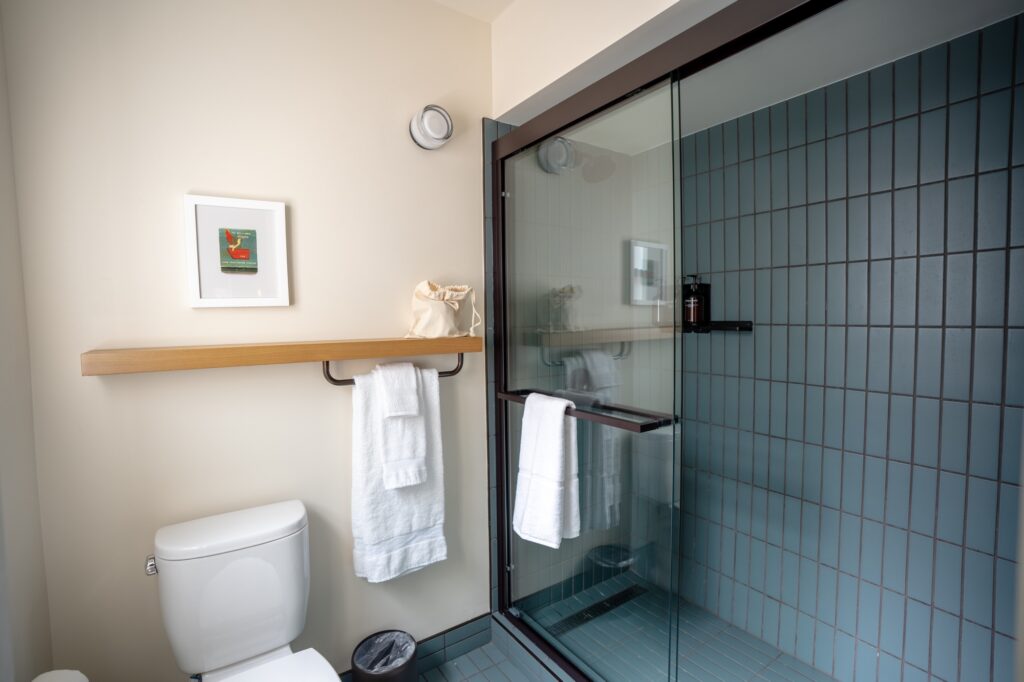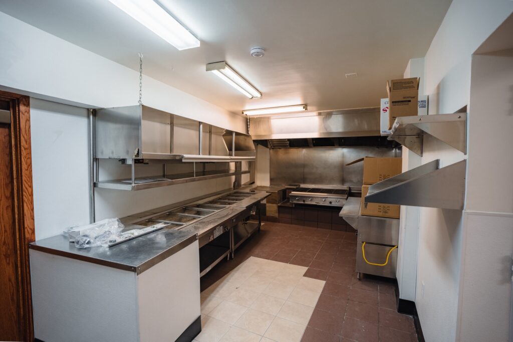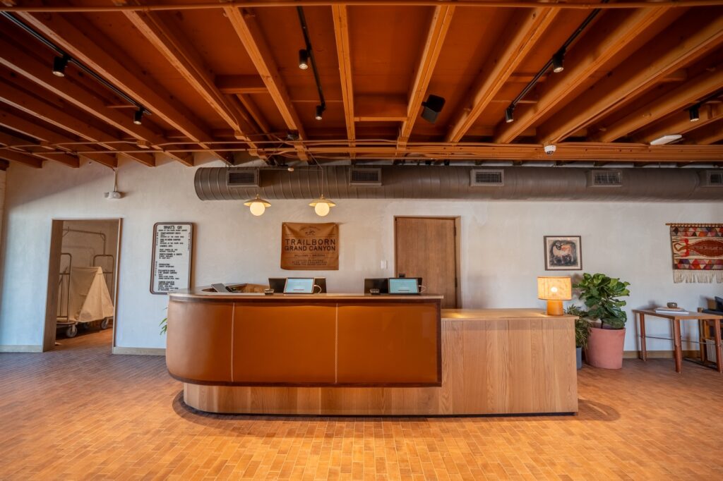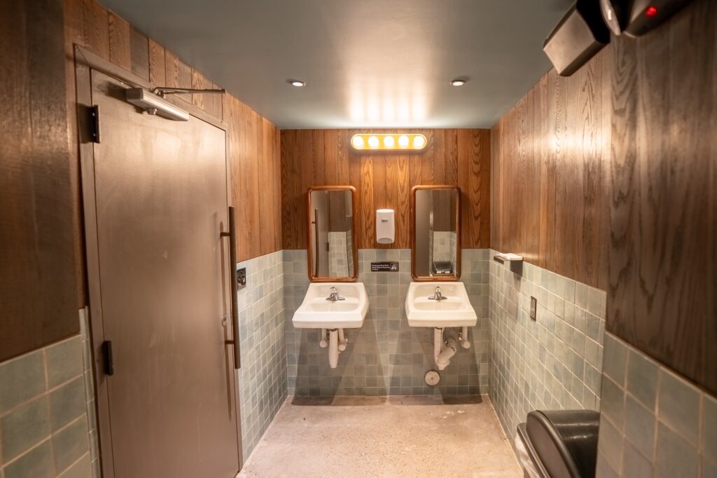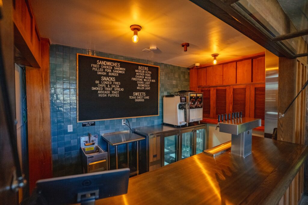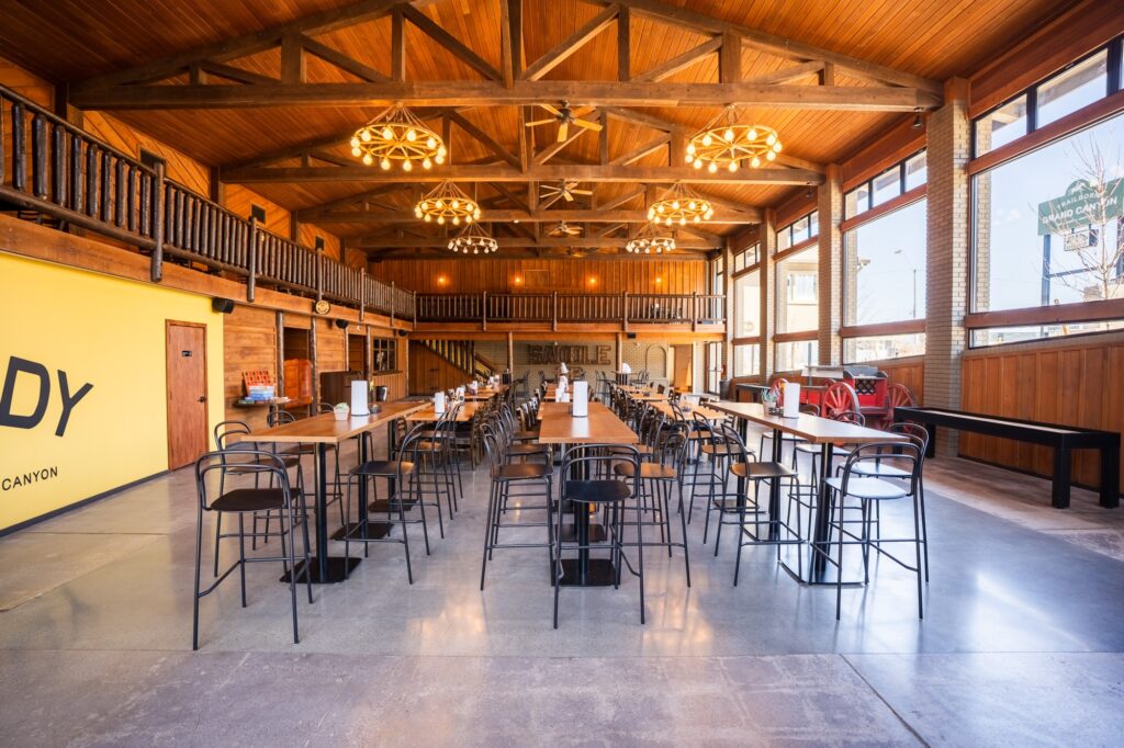 The main gathering space, known as “Camp Hall,” is a two-story building that underwent a full interior and exterior transformation. The renovated space now includes a large gathering hall, service bar with concession counter, and a welcoming lobby featuring a custom two-sided fireplace. Additional highlights include custom oak millwork cabinetry and display shelving, as well as a custom check-in counter with a leather-wrapped front and brass countertops.